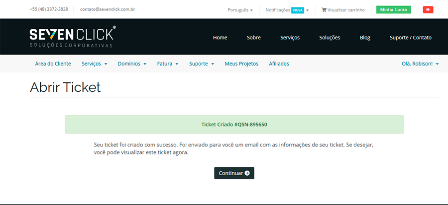 - Clique na aba "Suporte" e selecione a opção "Abrir Ticket" no menu suspenso.