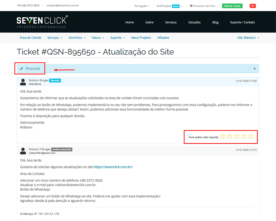 - Na tela do ticket, leia com atenção a resposta enviada pelo suporte para verificar se sua solicitação foi atendida.
